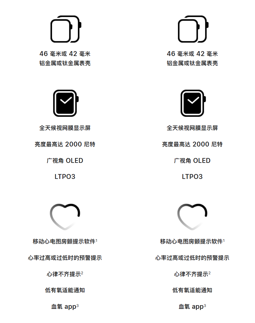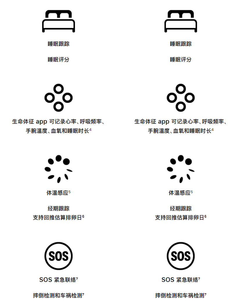 S9、S10、S11 都支持心率、血氧、体温、ECG、睡眠评分、高血压预警等 watchOS 26 常规功能,部分国区暂未开放使用。