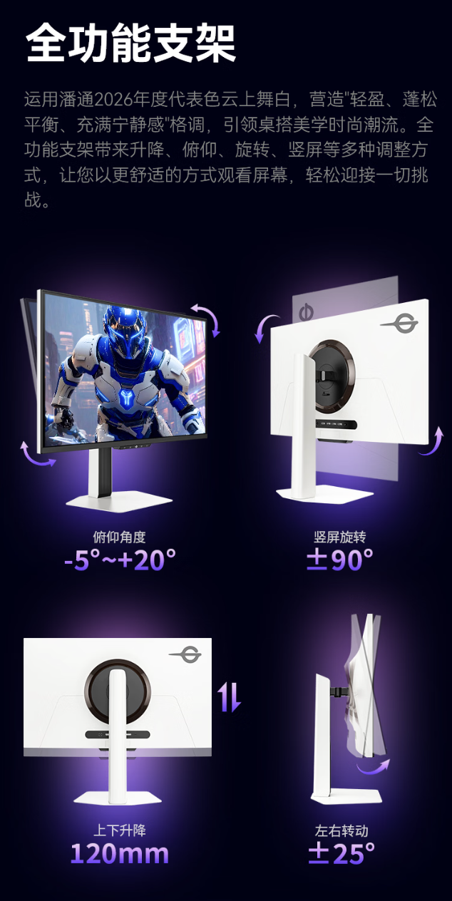 该机支架支持升降 / 倾斜 / 旋转,显示器本体支持 VESA 壁挂,提供 2 个 HDMI 2.1、2 个 DP 1.4、1 个 3.5mm 音频接口。