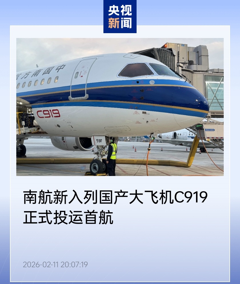 据央视介绍,自 2 月 2 日春运启幕,南航持续加大国产飞机的运力投入,C919 和 C909 飞机执行航班近 1400 班次,同比 2025 年春运同期增长 49.1%,承运旅客超 12.3 万人次,同比增长 60.3%。其中,南航国产大飞机 C919 机型已执行航班 275 班次,承运旅客超 3.8 万人次,客座率达 86.3%。