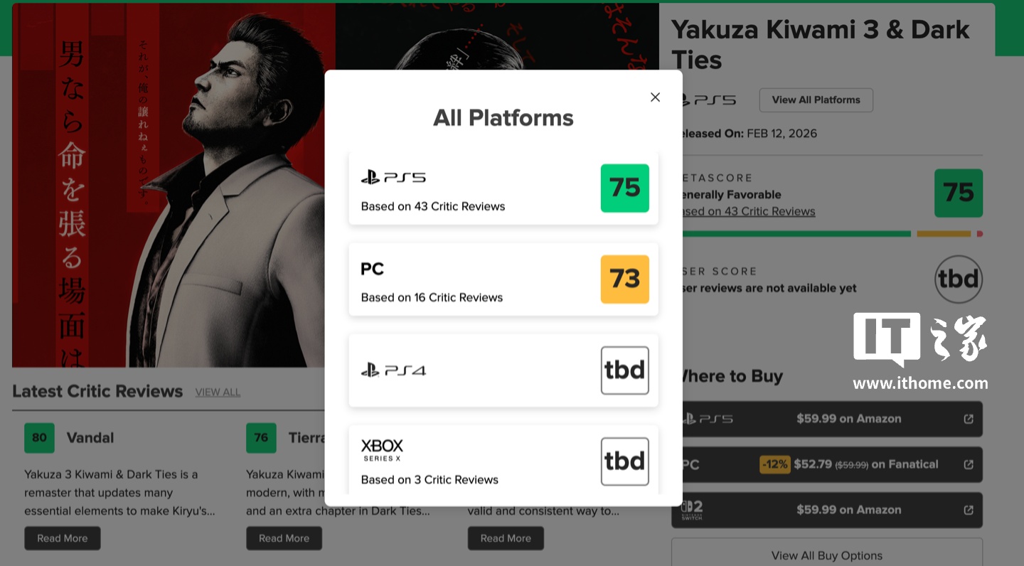 IT之家 2 月 11 日消息,世嘉旗下《人中之龙 极 3 /外传 Dark Ties(Yakuza Kiwami 3 & Dark Ties)》将于明天发售,登陆 PlayStation 5、Xbox Series X|S、任天堂 Switch 2、以及 PC 平台。IT之家附 Steam 商品页。