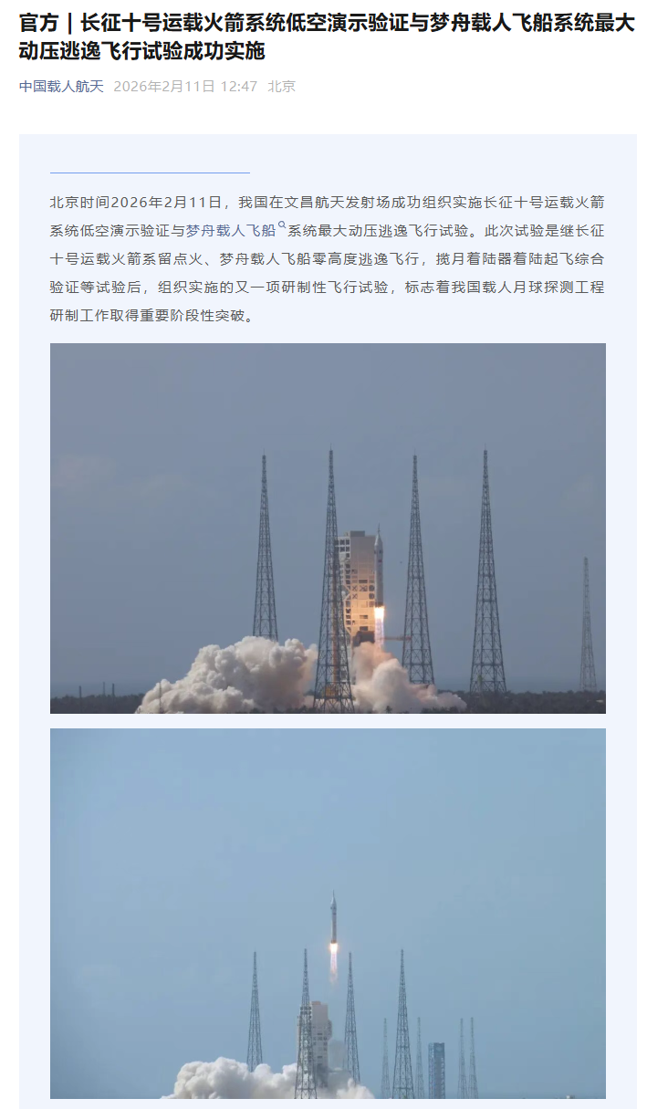 IT之家注意到,北京时间 2026 年 2 月 11 日,我国在文昌航天发射场成功组织实施长征十号运载火箭系统低空演示验证与梦舟载人飞船系统最大动压逃逸飞行试验。此次试验是继长征十号运载火箭系留点火、梦舟载人飞船零高度逃逸飞行,揽月着陆器着陆起飞综合验证等试验后,组织实施的又一项研制性飞行试验,标志着我国载人月球探测工程研制工作取得重要阶段性突破。