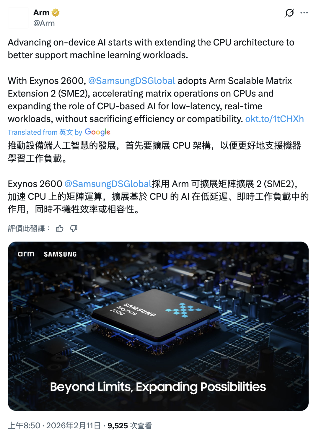 IT之家 2 月 12 日消息,Arm 官方昨天在 X 平台发文,宣布三星 Exynos 2600 芯片支持 SME2(IT之家注:第二代可扩展矩阵扩展)指令集,有望实现更高的端侧 AI 性能。