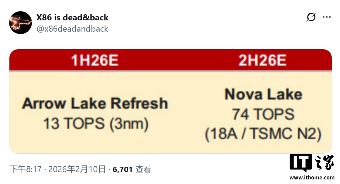 IT之家 2 月 13 日消息,科技媒体 overclock3d 昨日(2 月 12 日)发布博文,报道称英特尔 Nova Lake 桌面处理器将搭载第 6 代 NPU(NPU6),AI 性能高达 74 TOPS,相比 Arrow Lake-S 提升超 5 倍。