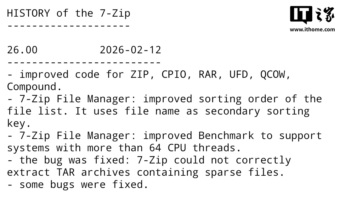 IT之家 2 月 13 日消息,当地时间 2 月 12 日,开源压缩软件 7-Zip 发布了最新的 26.00 正式版。