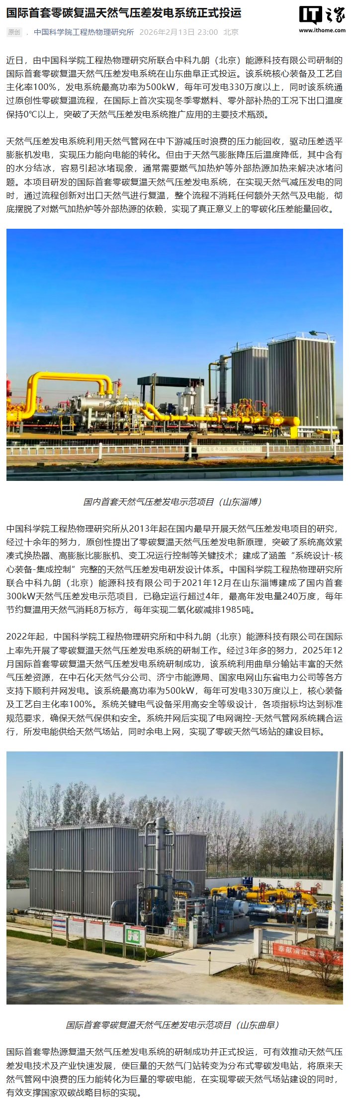IT之家 2 月 14 日消息,据“中国科学院工程热物理研究所”公众号,近日,由该所联合中科九朗(北京)能源科技有限公司研制的国际首套零碳复温天然气压差发电系统在山东曲阜正式投运。