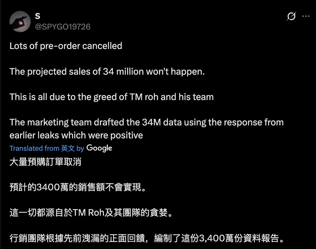 同时,另一名消息人士 @SPYGO19726 也对此表示,大量消费者取消了 Galaxy S26 系列的预定订单,三星预期的 3400 万台销量很难实现,而且一切均源于“卢泰文及其团队的贪婪”(IT之家注:卢泰文是三星 MX 事业部负责人),他们团队根据先前泄露的正面回馈下定了 3400 万台销量目标。