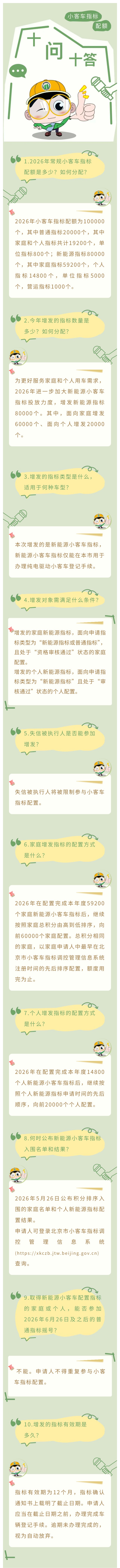 根据北京市交通委员会通告,2026 年小客车指标配额为 100000 个,其中普通指标 20000 个,家庭和个人指标共计 19200 个,单位指标 800 个;新能源指标 80000 个,其中家庭指标 59200 个,个人指标 14800 个,单位指标 5000 个,营运指标 1000 个。