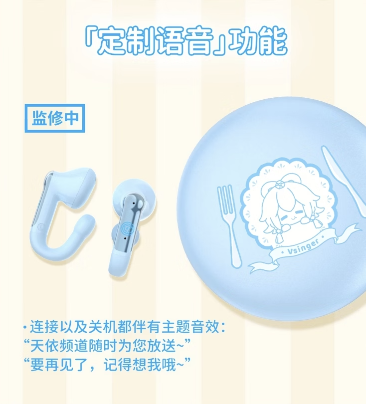 据介绍,该耳机充电盒带有甜甜圈及洛天依立体浮雕。耳机提供了 13mm 动圈,内置定制语音,连接 / 关机时均带有主题音效。单耳机续航 4-5 小时,在配合充电盒的情况下续航至高 24 小时。