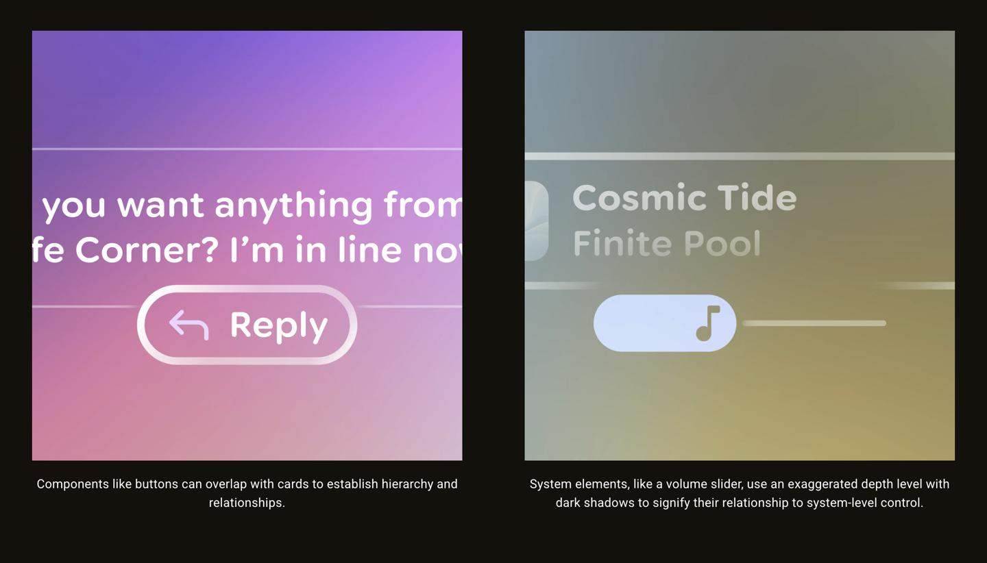 谷歌高级视觉设计师 David Allin Reese 在专文中系统阐述了这一设计思路。与苹果 visionOS 采用有色与磨砂玻璃质感、通过对比增强可见性的风格不同,谷歌更强调“将界面置于手臂长度之外”的理念。界面元素仿佛悬浮在视野前方,而不是贴附在现实世界之上。