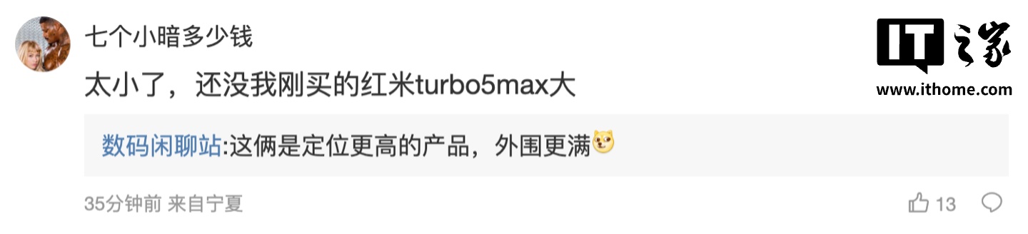 后续有用户在评论区询问:“太小了,还没我刚买的红米 turbo5max 大”,博主回复道:“这俩是定位更高的产品,外围更满