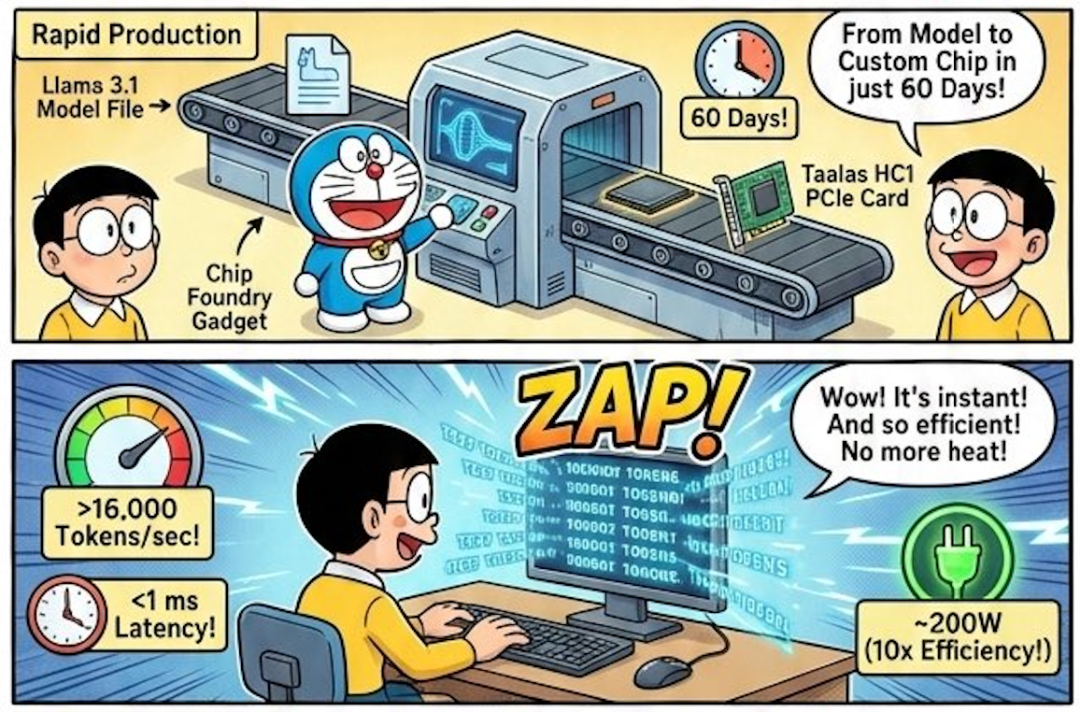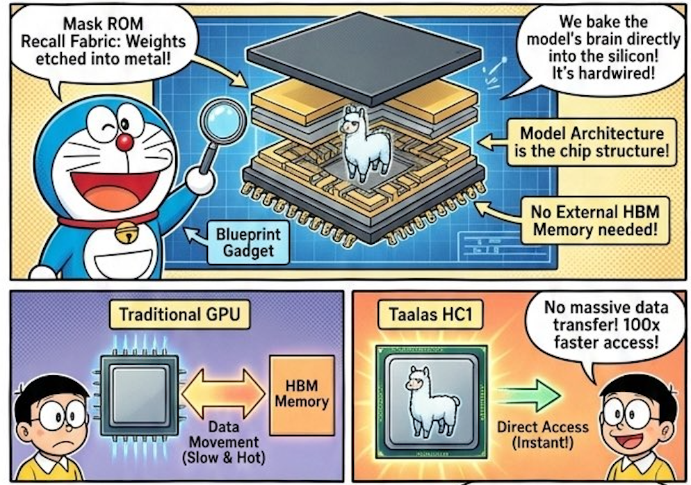 随后,他又创立了 Taalas,试图通过类似硅基编译器的方式,直接将 AI 模型转化为硅芯片。