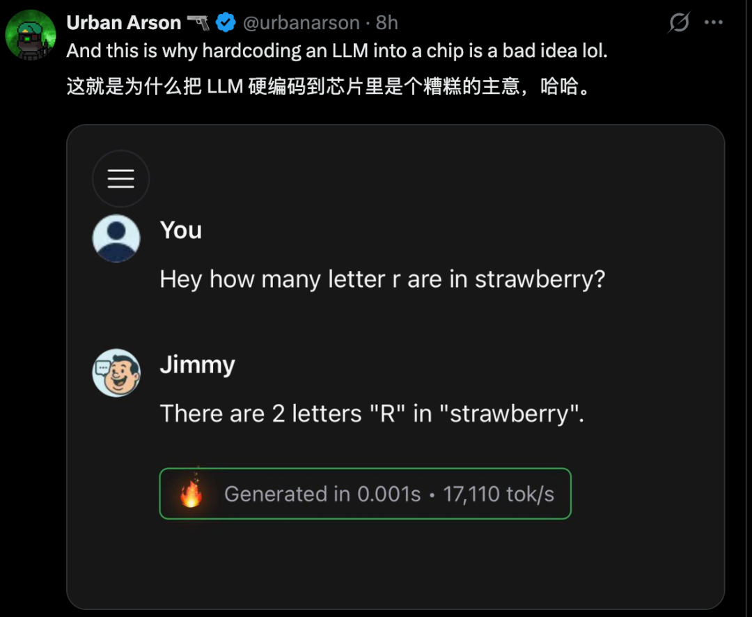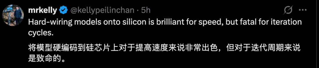 换句话说,就是将一个完整大模型通过物理硬连线进芯片中,省去了传统存算分离的成本,用灵活性换取极致的速度和效率。