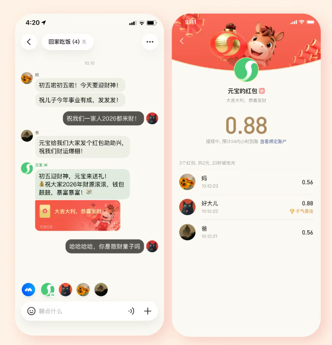 据介绍,该活动不需要复杂操作,只要在元宝派里保持活跃和派友聊天、一起听、一起看、一起迎财神。当派里气氛烘托到位时元宝就会化身“财神”,派发惊喜红包。元宝在派里发放的是拼手气红包,能抢到多少全凭手气。