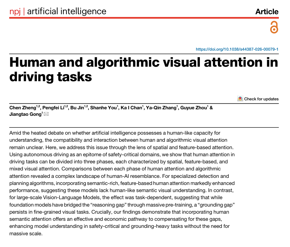 IT之家 2 月 21 日消息,清华大学智能产业研究院(AIR)今日宣布,其团队在自然子刊《npj Artificial Intelligence》上发表研究,揭示了人类与智驾算法视觉注意力的本质差异。