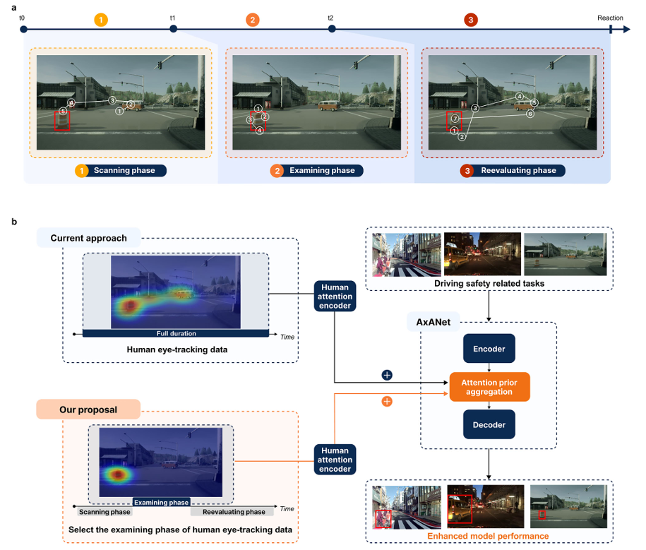 研究将人类视觉注意力划分为扫描(刺激驱动)、检查(语义评估)、重新评估(任务驱动)三阶段,其中检查阶段平均持续 705.75 毫秒(专家)和 622.52 毫秒(新手)。当将该阶段注意力特征融入 AxANet 等算法后,异常检测准确率从 0.724 提升至 0.736,轨迹规划误差降低 11.1%(0.72 米 → 0.62 米)。在视觉语言模型测试中,仅细粒度任务(如 3D 描述)因存在“接地鸿沟”获得显著提升。