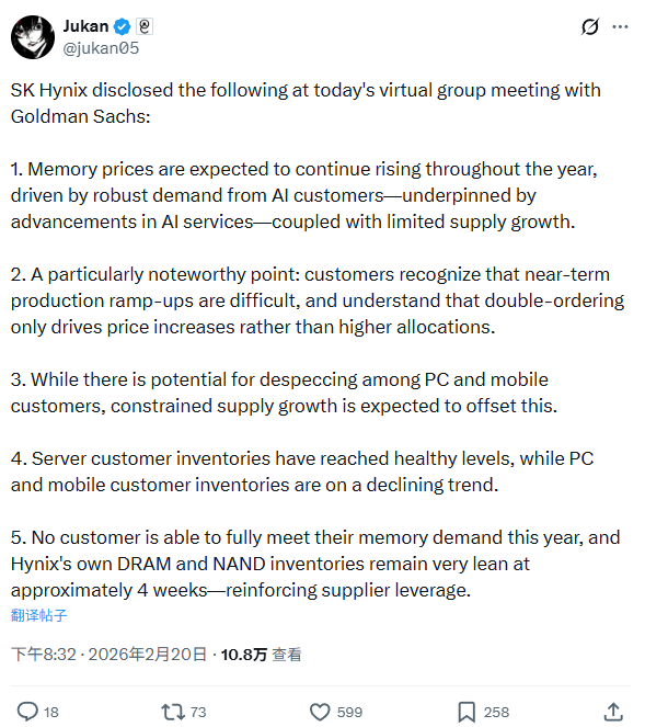 IT之家 2 月 21 日消息,SK 海力士今日在与高盛集团举行的线上会议中披露了一系列关键市场研判,明确指出在 AI 客户强劲需求与供应增长受限的双重作用下,内存价格预计将在整个 2026 年保持上涨态势。