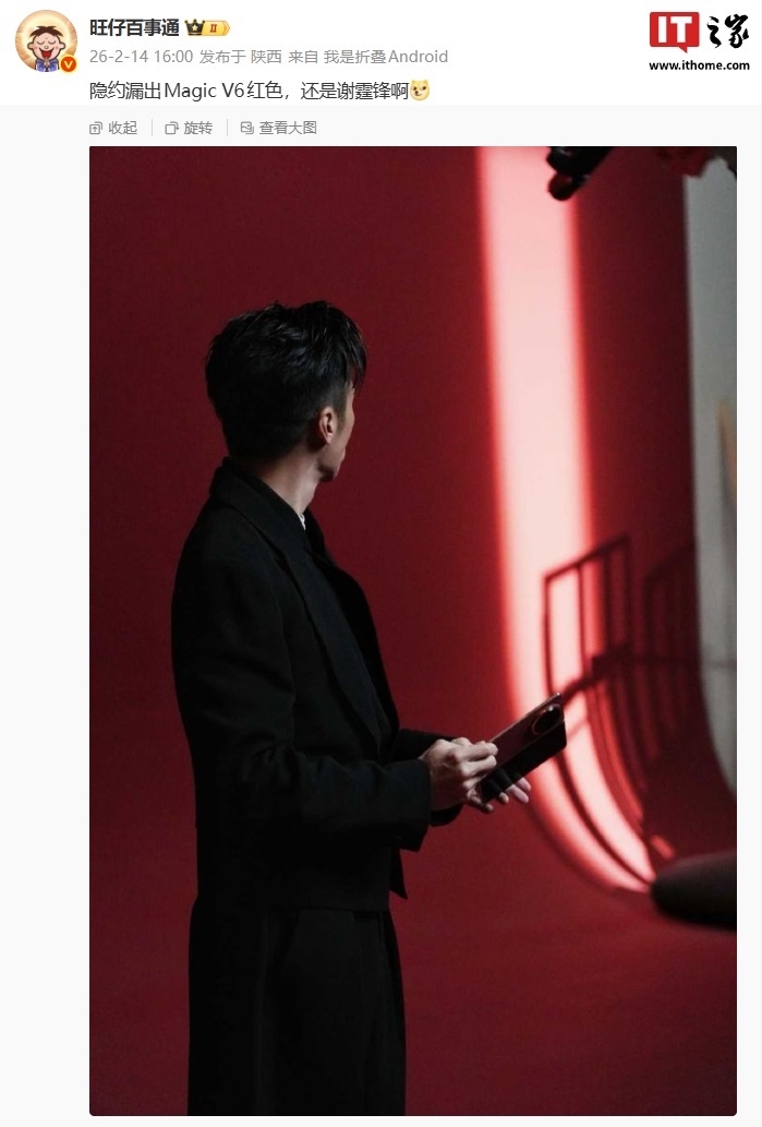 而博主 @旺仔百事通曾在此前发布爆料图片,图中显示谢霆锋正手持一款折叠屏手机。博主称这款手机是荣耀 Magic V6 的红色版本。
