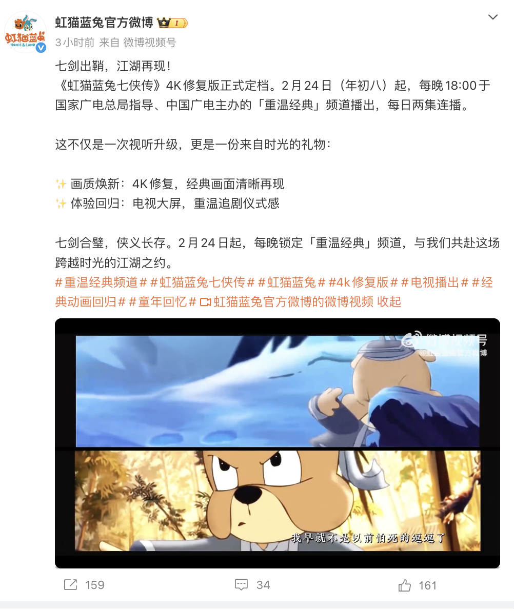 据介绍,《虹猫蓝兔七侠传》4K 修复版将在国家广电总局指导、中国广电主办的「重温经典」频道播出,每日两集连播。