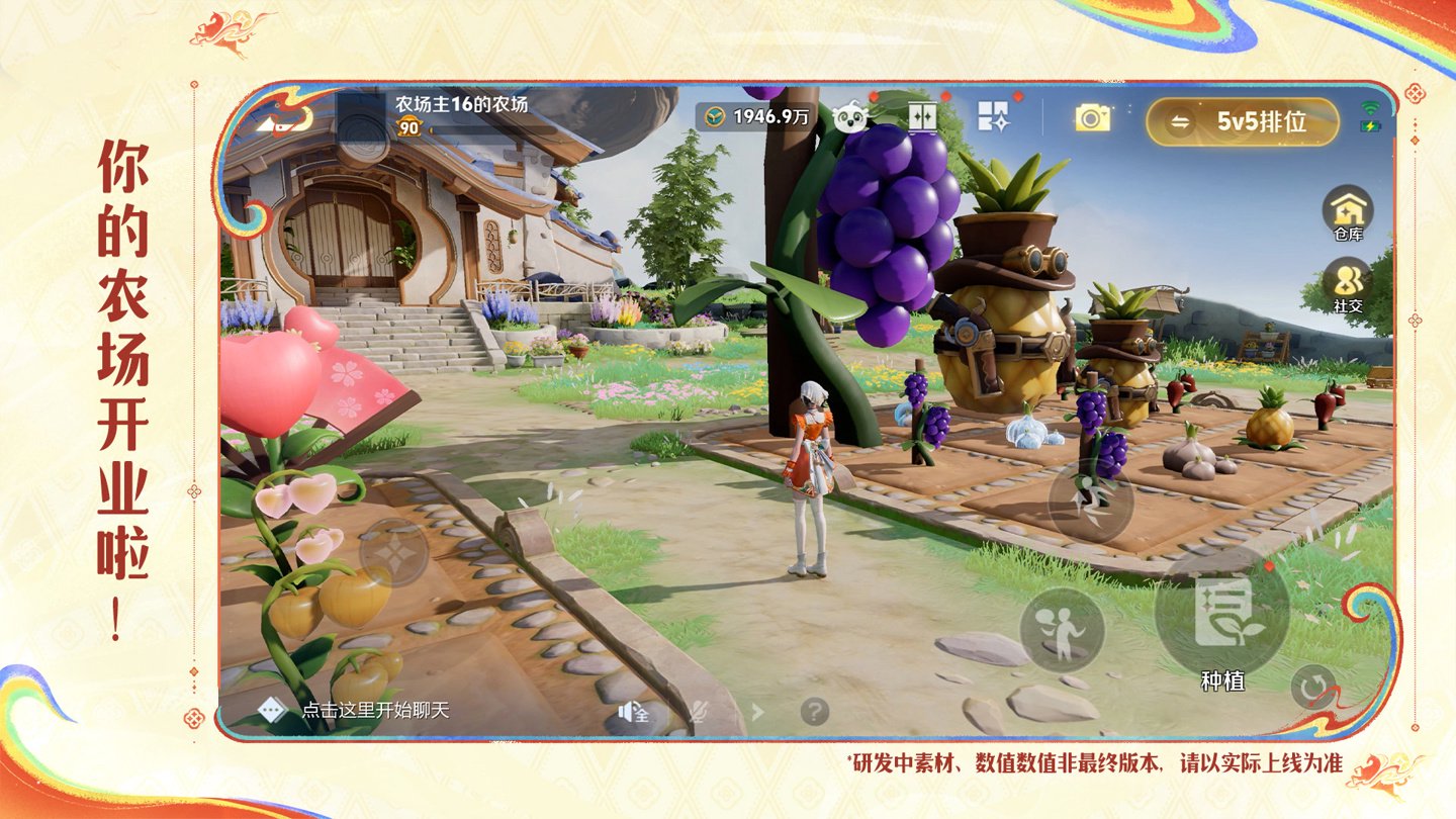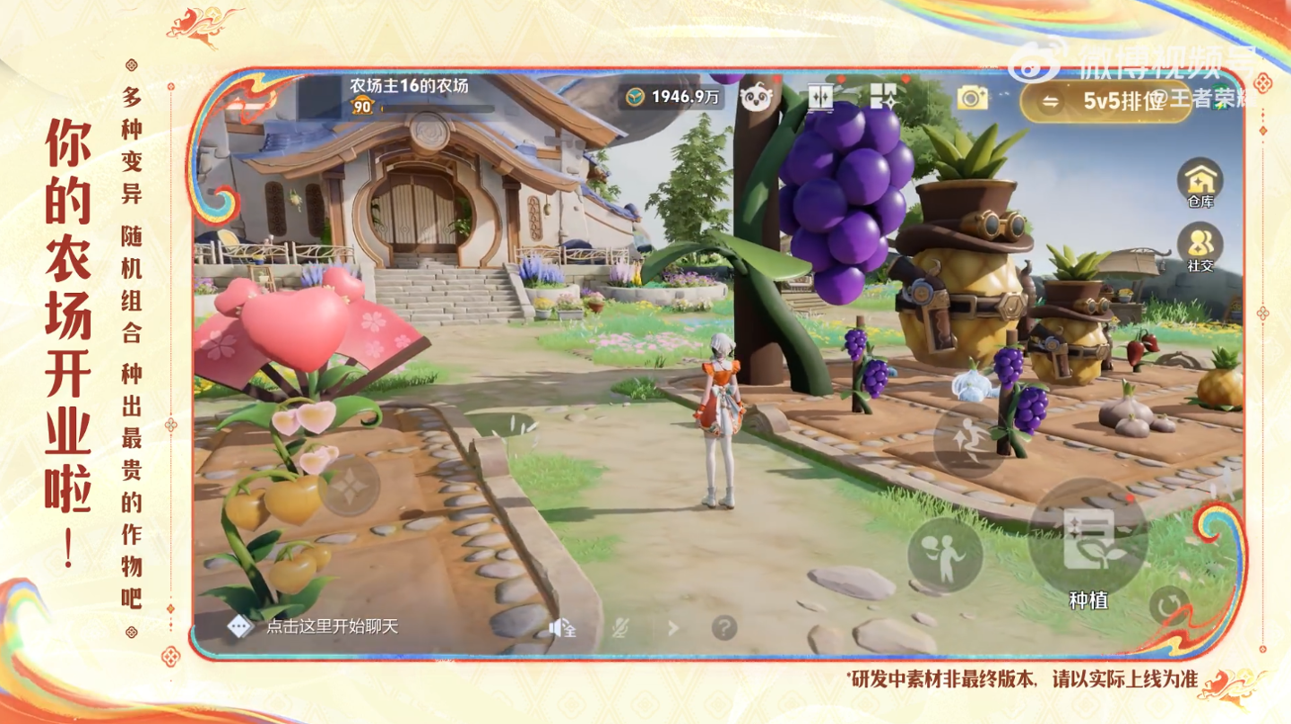 官方预告视频显示,农场玩法提供数十种作物种植,支持自由转动视角等操作,预计还拥有升级田地、作物变异等玩法。同时,部分作物还拥有英雄的特征,例如酷似马可波罗的“马可菠萝”、小乔的扇子等。