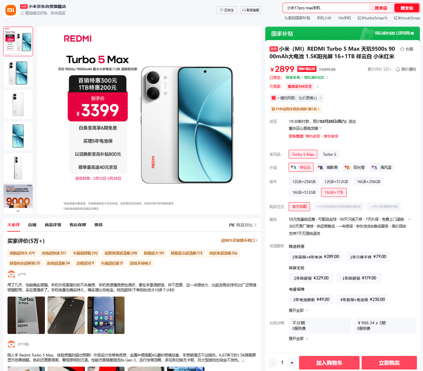 小米商城显示,REDMI Turbo 5 Max 已无法购买,仅提供“到货通知”按钮(四种配色均无法购买)。京东当前仍可以购买,相关页面显示,该机国补领后价 2899 元。