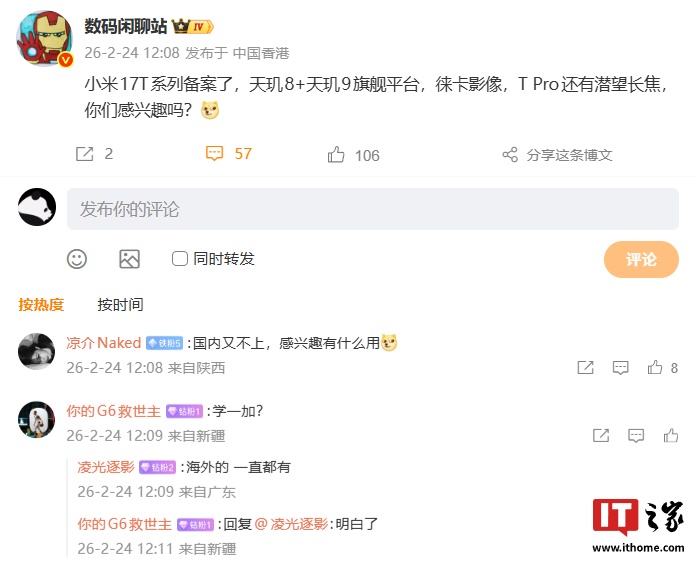 IT之家 2 月 24 日消息,博主 @数码闲聊站 今日发文透露,小米 17T 系列已备案,新机采用天玑 8 + 天玑 9 旗舰平台,有徕卡影像加持,其中 T Pro 还有潜望长焦。