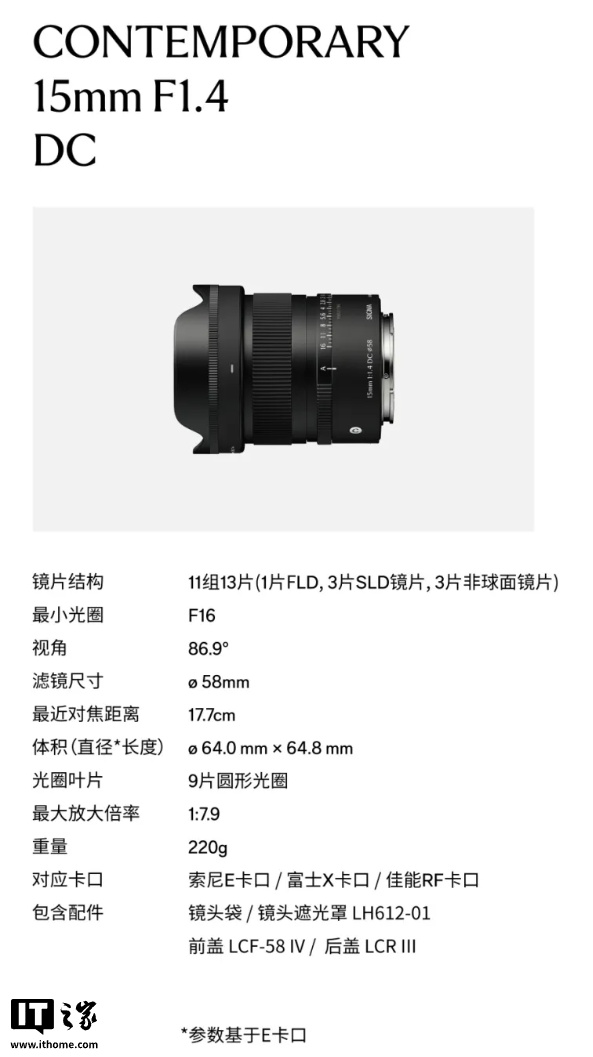适马 15mm F1.4 DC | Contemporary 可选 E、X、RF 卡口版本,海外售价 579 美元(现汇率约合 4005 元人民币),IT之家附参数表如下: