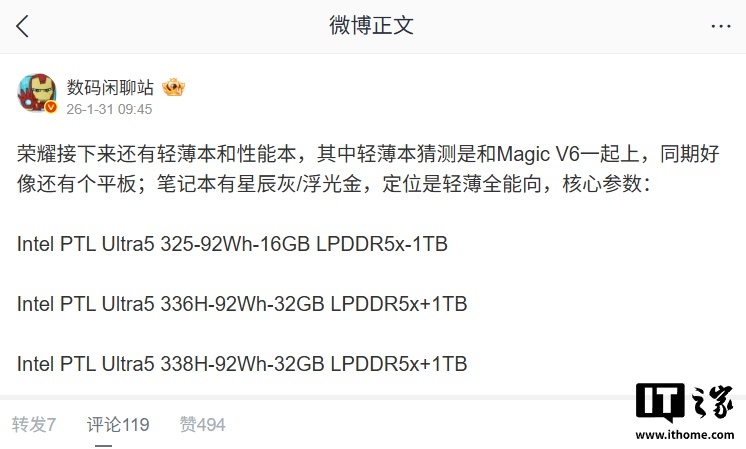 结合IT之家此前援引博主 @数码闲聊站 消息,荣耀的新款笔记本将提供星辰灰与浮光金两种配色方案,产品定位为“轻薄全能”,搭载英特尔最新“Panther Lake”处理器,配备 92Wh 大电池。