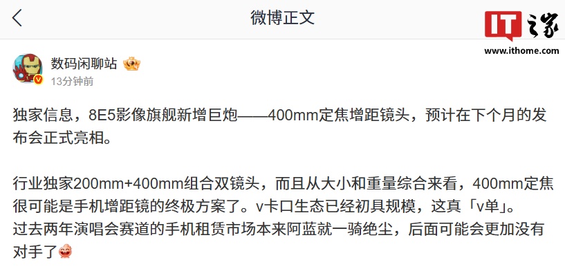 IT之家 2 月 25 日消息,博主 @数码闲聊站 今日再曝光一款新机配件信息:蓝厂骁龙 8E5 影像旗舰将新增巨炮 —— 400mm 定焦增距镜头,预计在下个月的发布会正式亮相。