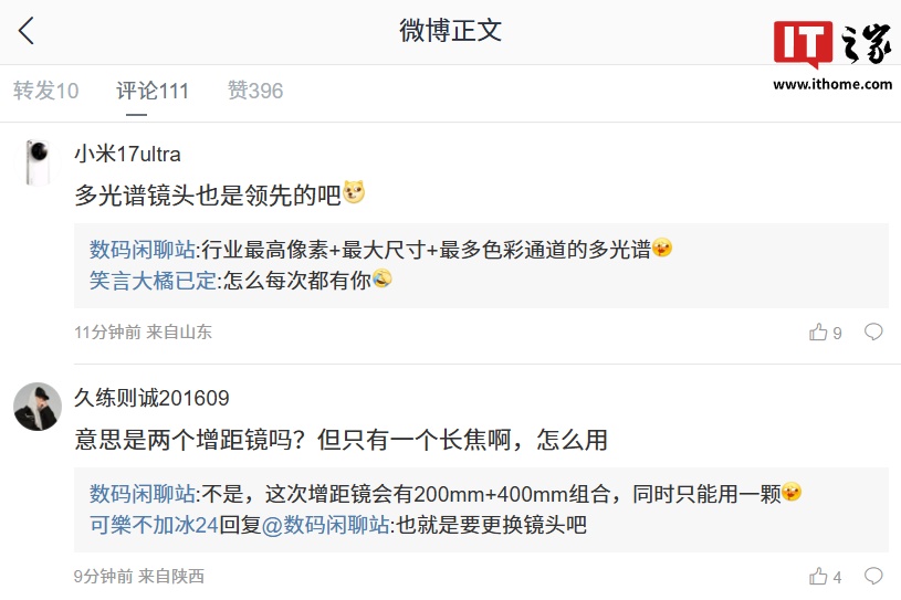 有网友询问新机的多光谱镜头是否领先?博主回复称:“行业最高像素 + 最大尺寸 + 最多色彩通道的多光谱。”还有网友询问新机是否会搭载两个增距镜?博主表示:“不是,这次增距镜会有 200mm + 400mm 组合,同时只能用一颗。”
