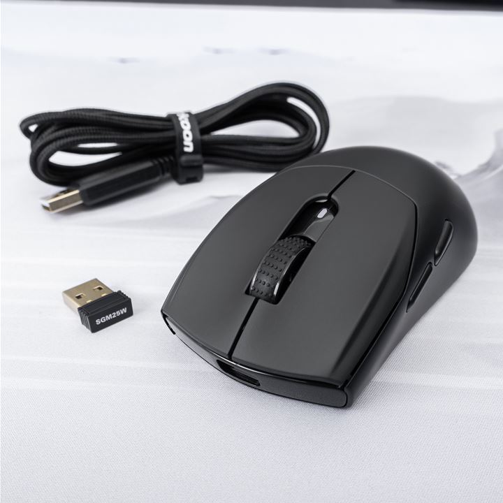 SKILLER SGM25W 基于 12000DPI 的原相 PAW3311 光学传感器,配备环诺 20M 按键微动,支持 1000Hz 采样率,内置的 400mAh 锂离子电池可提供最大 40 小时无线续航,重 59g。