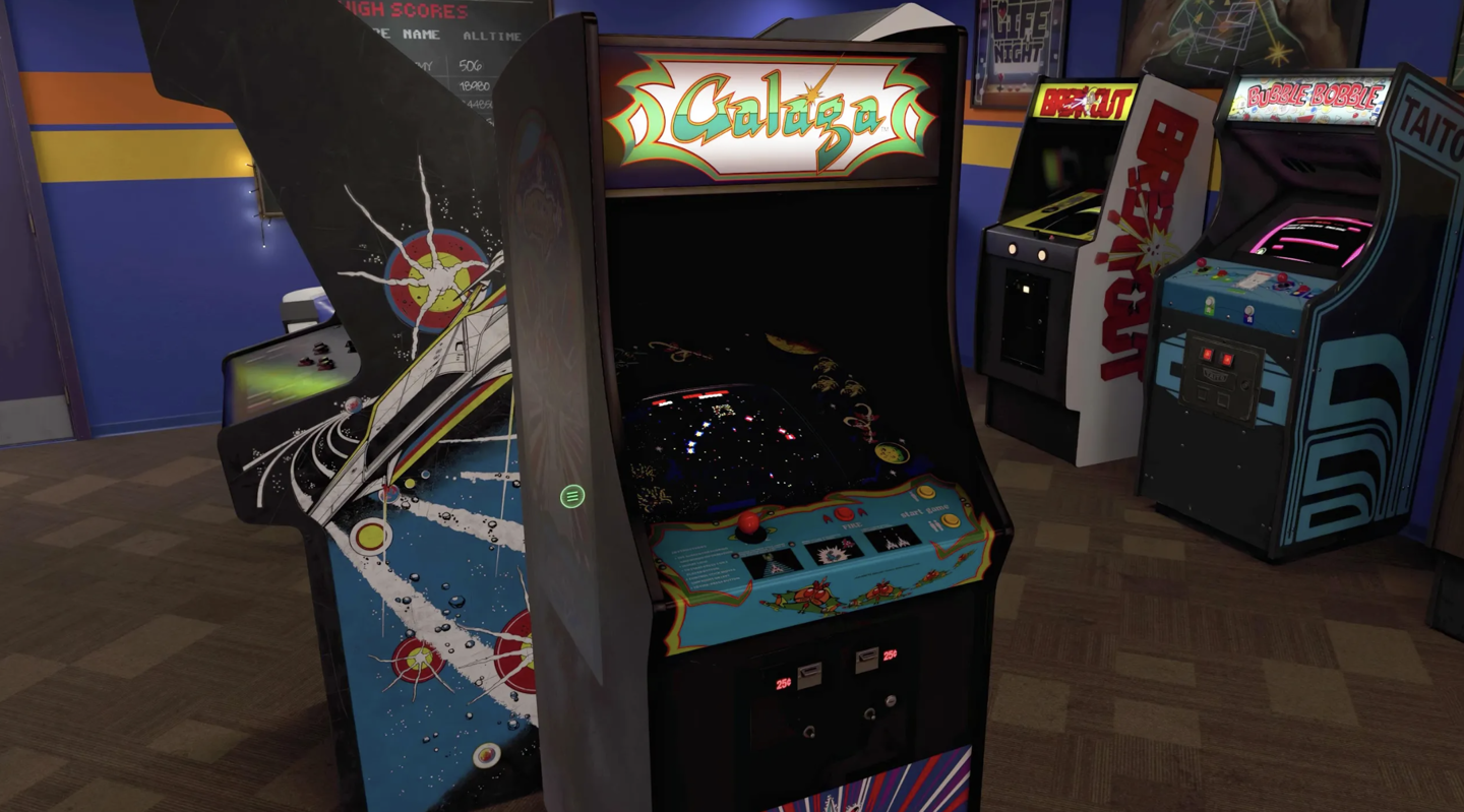据介绍,玩家在 Vision Pro 上启动游戏后,即可将 10 款正版授权游戏街机放在自己的房间里游玩,也可启动完全沉浸模式,进入一个 80 年代风格的游戏室中体验各台机器,10 款街机包含: