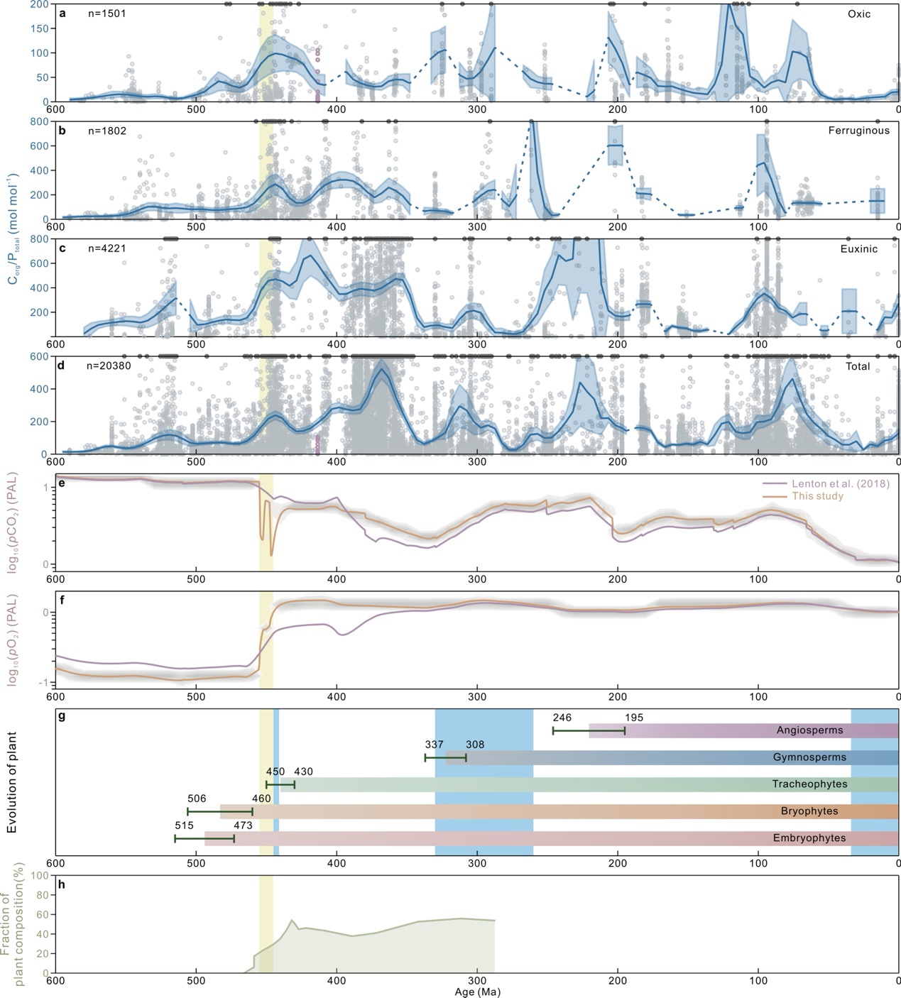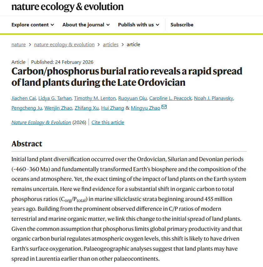 我国科研团队此番研究推翻了传统观念。后者认为,陆地植物在 4.2 亿年前后才开始大规模繁盛。然而,研究团队对全球多个地区的海相碎屑沉积记录进行了系统分析,发现有机碳 / 磷比值自约 4.55 亿年前开始显著升高。综合评估表明,这反映与早期陆地植物扩张相关的陆地生产力显著增强。