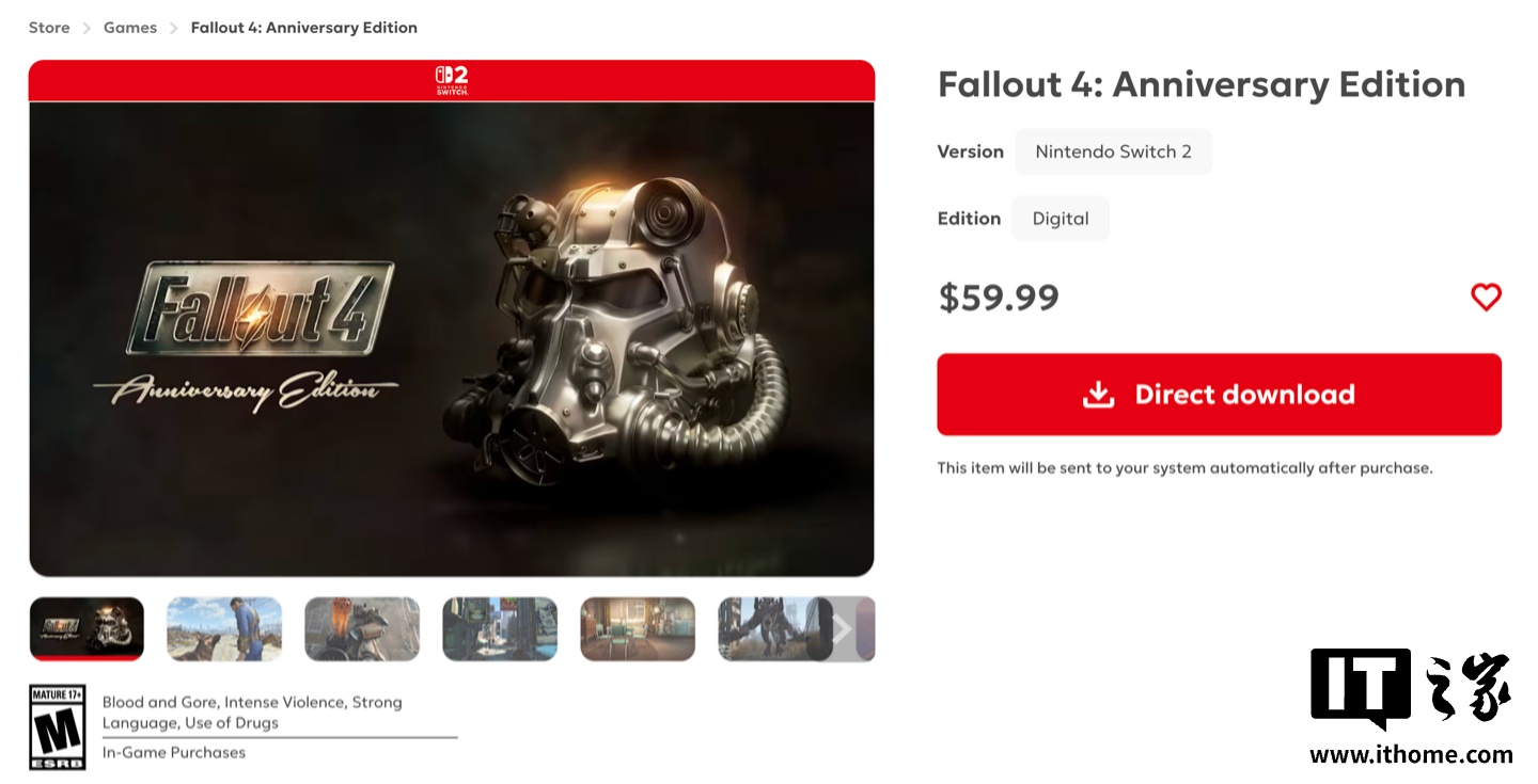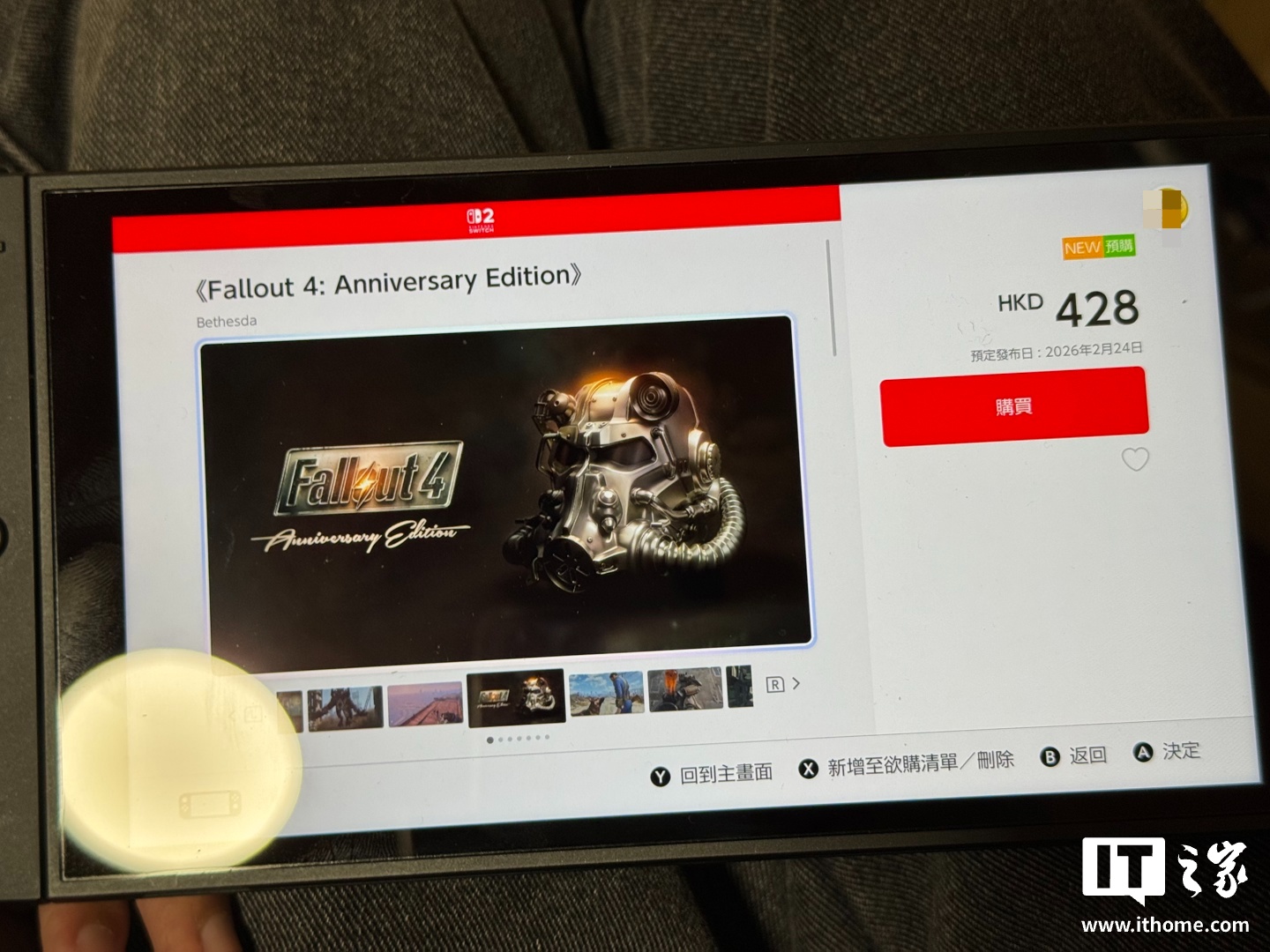 IT之家 2 月 25 日消息,Bethesda Game Studios 宣布,《辐射 4 周年版(Fallout 4:Anniversary Edition)》数字版现已正式登陆 Nintendo Switch 2,在任天堂 eShop 美服定价 59.99 美元(IT之家注:现汇率约合 413.3 元人民币)、港服 428 港币(现汇率约合 376.9 元人民币)。游戏实体版 4 月 28 日发售。