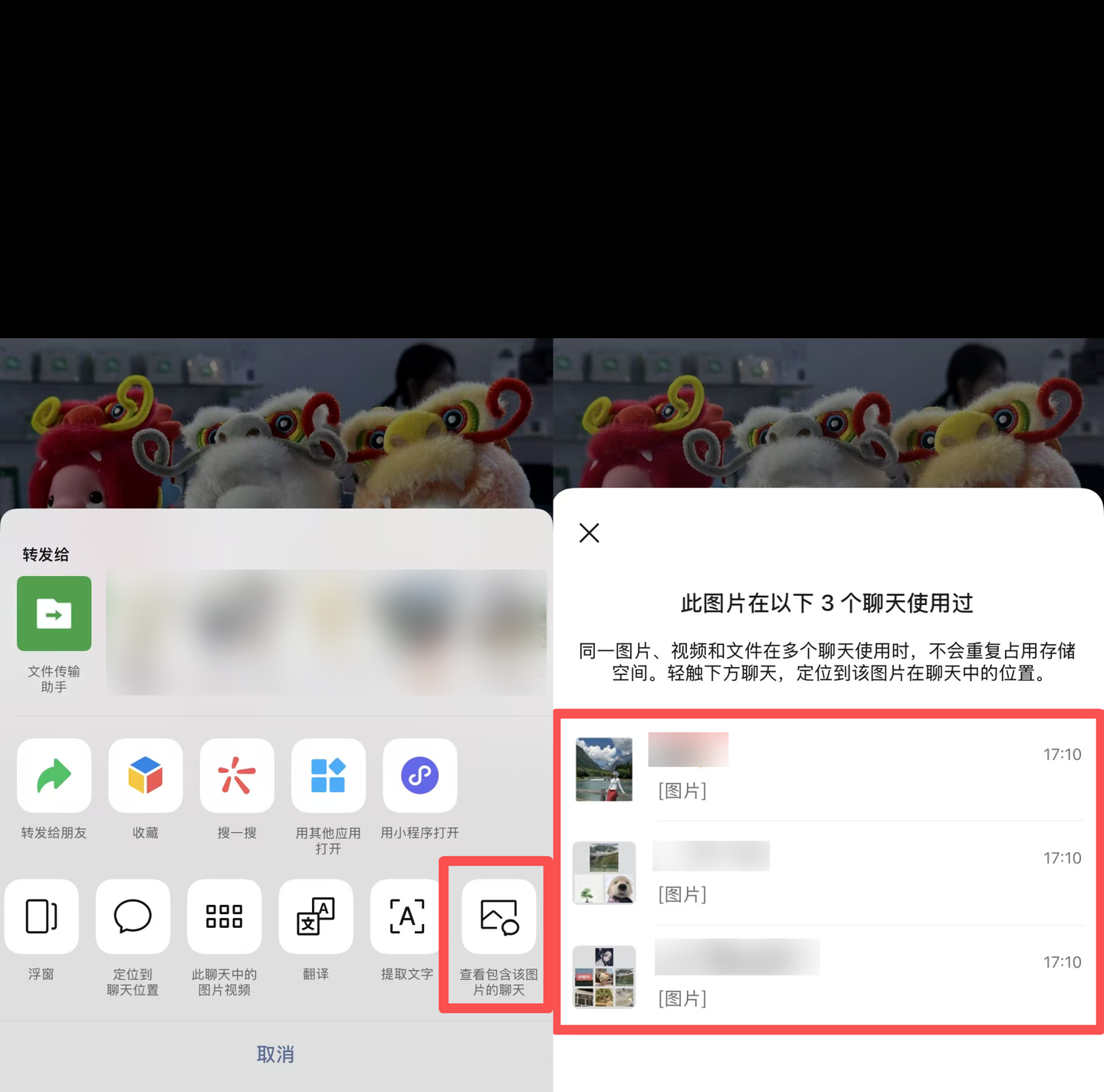 如图所示,如果用户已经忘记图都发给了谁,可以通过长按图片点击「查看该图片包含的聊天」,从而迅速锁定这张图的“流向”,点击聊天还能看看当时聊天记录。