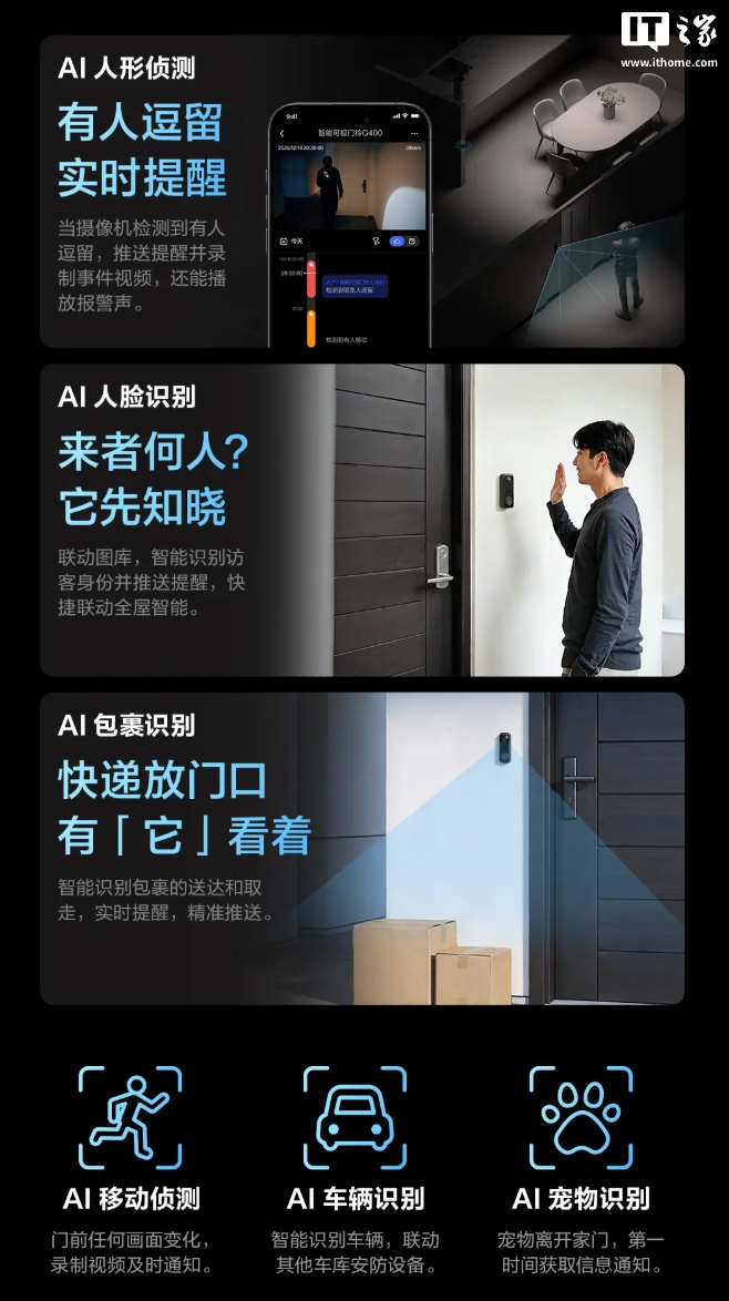 该产品拥有 IP65 防护,采用常供电设计(不支持电池供电),内置 2K 分辨率传感器,支持 AI 人形侦测 / 人脸识别 / 包裹识别,搭载双频 Wi-Fi 6 和 RJ45 网口,预留 Micro SD 卡槽。