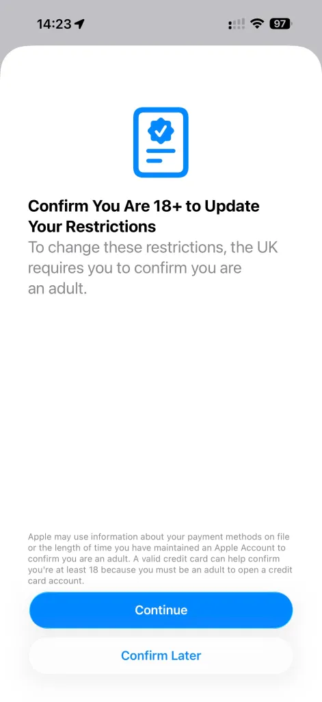 对于符合条件的用户,整个过程仅需三步,整个过程耗时极短。安装测试版后,“设置”应用中便会出现一条新的提示。下一个界面则解释了进行年龄验证的原因,并告知苹果或许已能判断其年龄。此时,用户仅需点击“继续”按钮,即可完成全部流程。