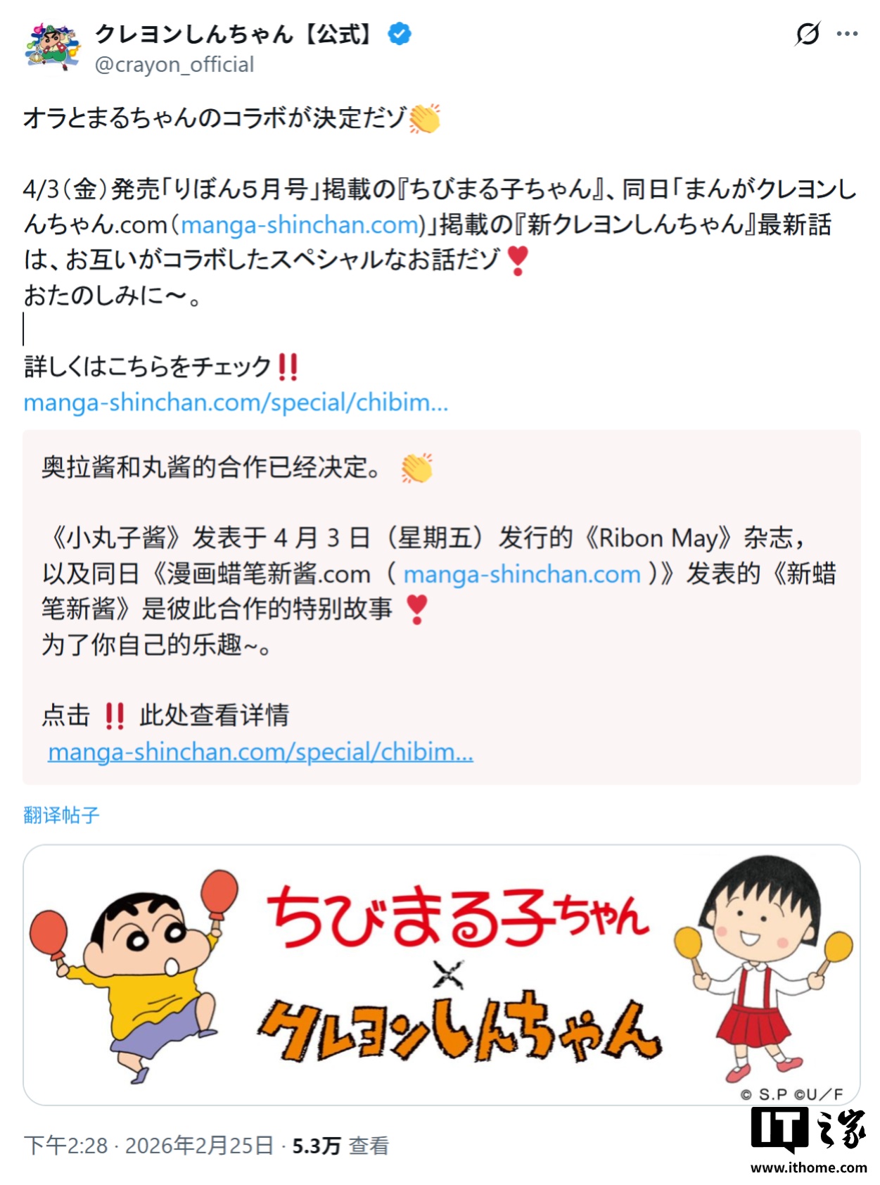 IT之家 2 月 26 日消息,媒体 animenewsnetwork 昨日(2 月 25 日)发布博文,报道称为庆祝《樱桃小丸子》诞生 40 周年与《蜡笔小新》诞生 35 周年,双方制作团队宣布推出特别合作联动漫画,将于 4 月 3 日在集英社旗下杂志及官方连载网站上发布。