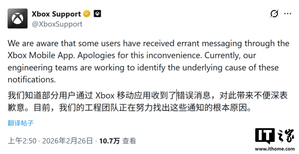 微软随后迅速发声以平息用户的恐慌情绪。Xbox 官方支持团队在社交媒体上发布声明称,官方已知悉部分用户收到了错误消息,并对由此造成的不便深表歉意。官方同时强调,工程团队目前正在全力查明导致这些通知异常发送的根本原因。IT之家附上相关截图如下: