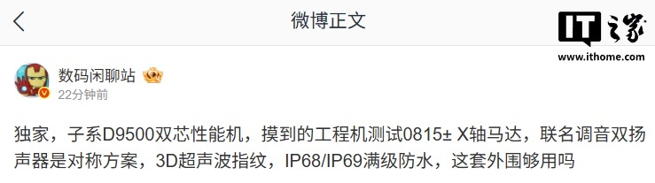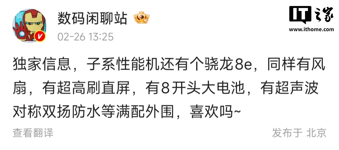 IT之家 2 月 26 日消息,博主 @数码闲聊站 今日爆料称,某厂子系性能机搭载骁龙 8 至尊版处理器,同样有风扇、超高刷直屏、超 8000mAh 大电池、超声波指纹、对称双扬、防水等满配外围。