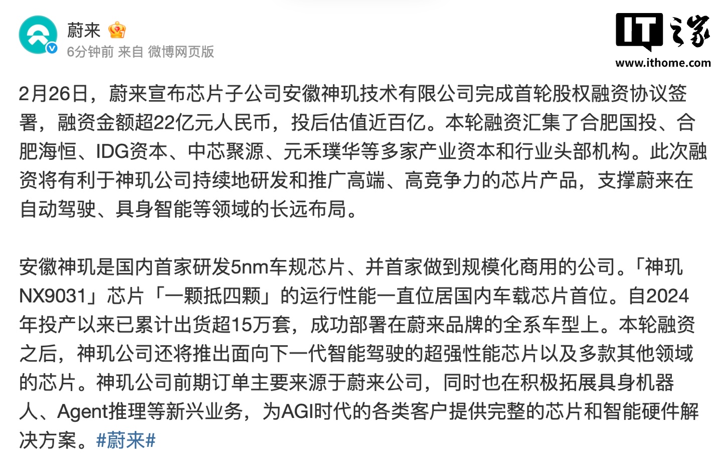IT之家 2 月 26 日消息,今天傍晚,蔚来通过官微宣布:其芯片子公司安徽神玑技术有限公司完成首轮股权融资协议签署,融资金额超 22 亿元人民币,投后估值近百亿。