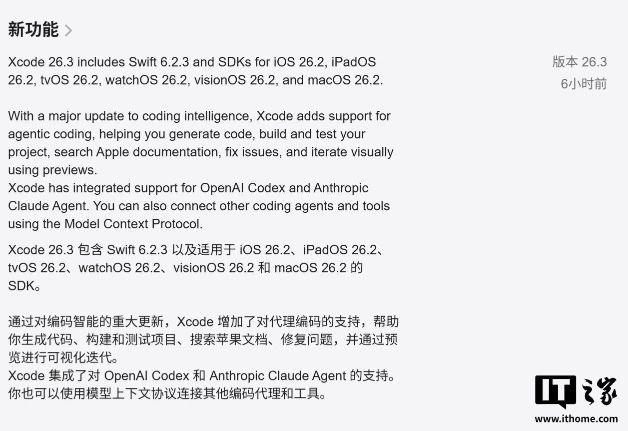 IT之家 2 月 27 日消息,苹果公司今天(2 月 27 日)正式发布 Xcode 26.3 更新,核心亮点是引入了“自主 AI 编码智能体”(AI agents),不仅内置 Swift 6.2.3,更原生整合了 OpenAI Codex 与 Anthropic Claude。
