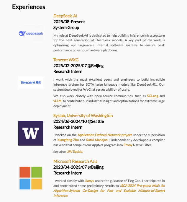 他目前在 DeepSeek 系统组,参与下一代模型的推理基础设施建设,负责大规模软件系统在多硬件平台上的性能优化。