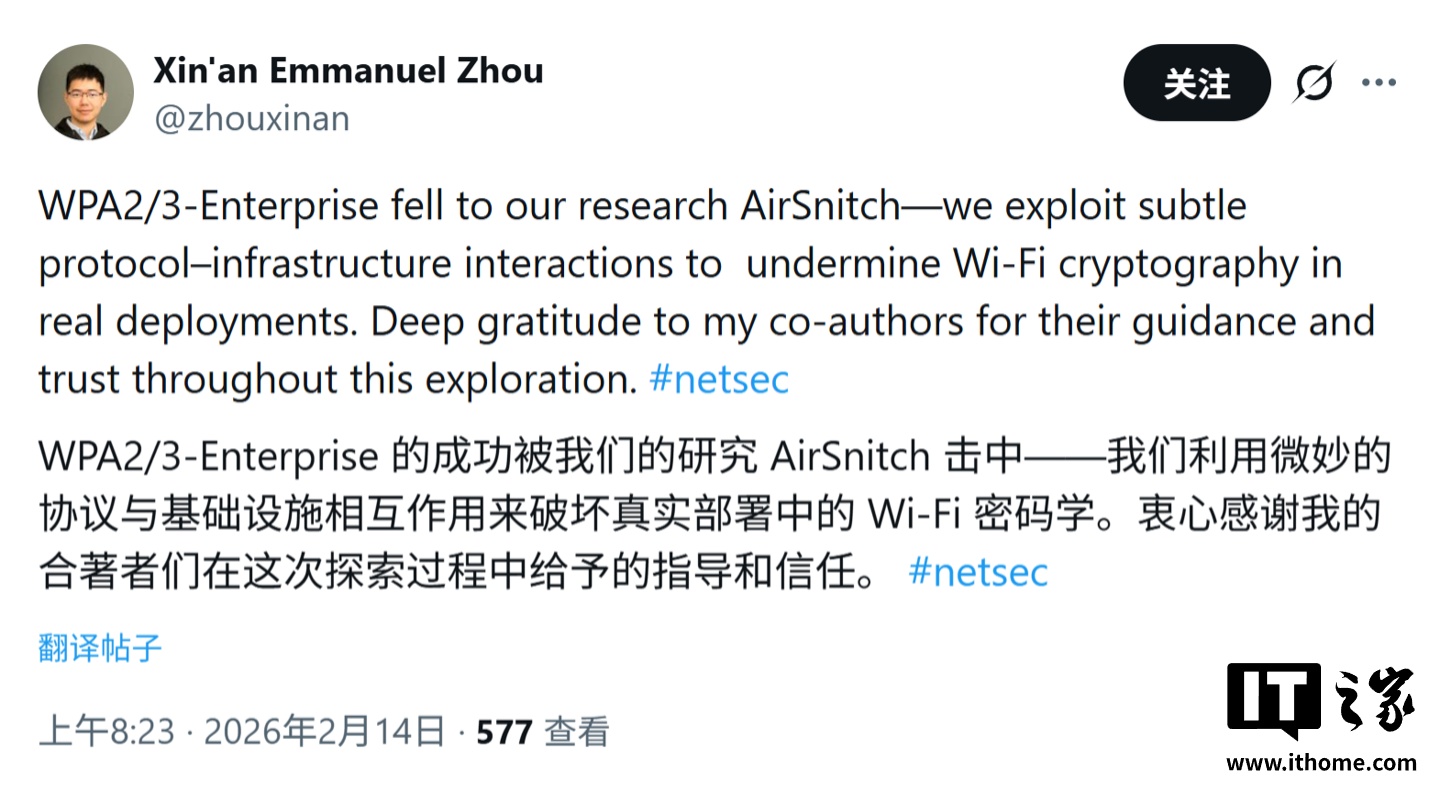 IT之家 2 月 27 日消息,科技媒体 Tom's Hardware 今天(2 月 27 日)发布博文,报道称加州大学河滨分校的研究团队发现严重 Wi-Fi 漏洞,将其命名为 AirSnitch,在网件(Netgear)等五款热门家用路由器上均成功复现。