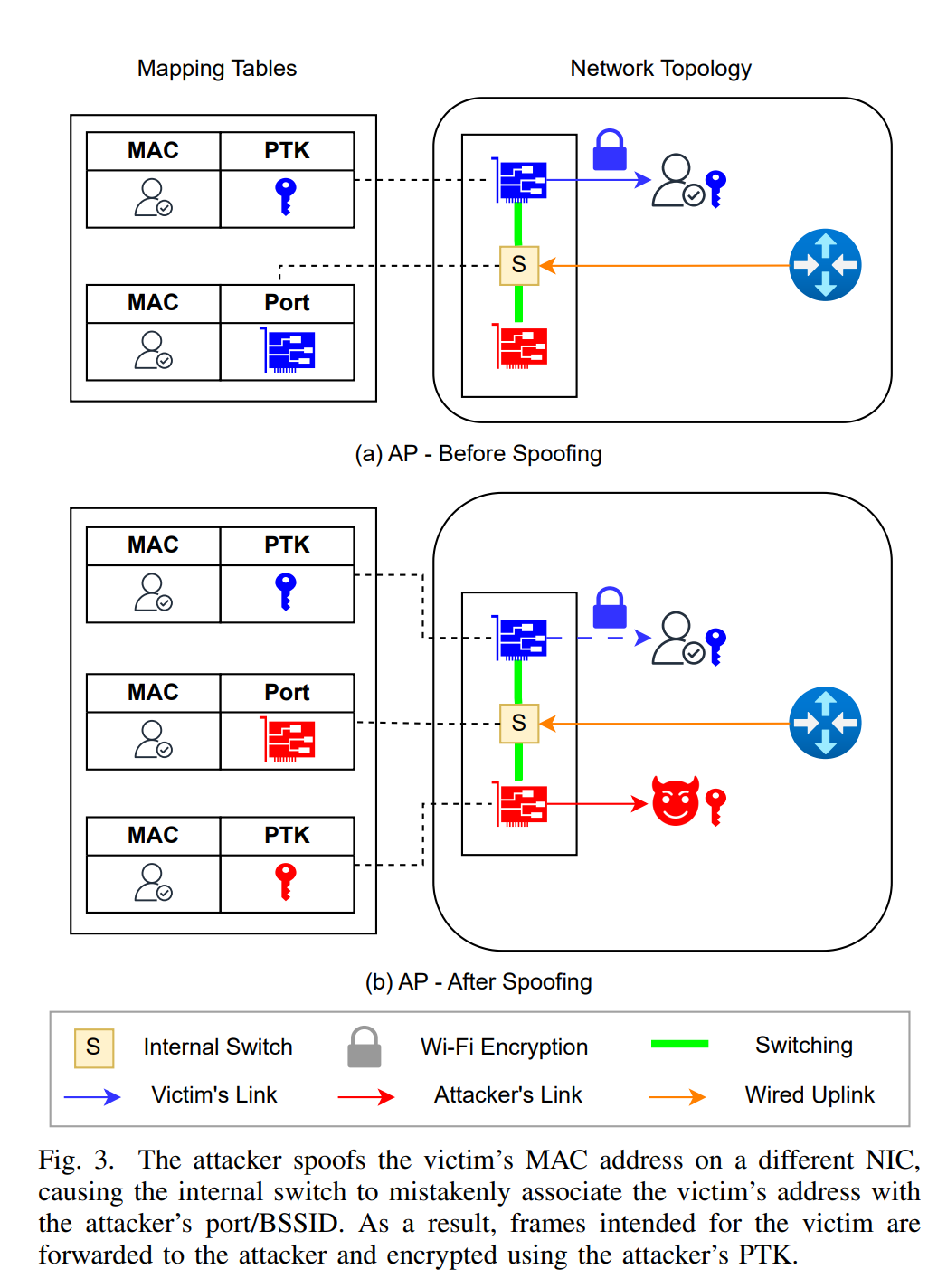 IT之家援引博文介绍,该漏洞的根源在于 Wi-Fi 网络栈自身的底层架构缺陷。Wi-Fi 协议在网络栈的第一、第二和第三层之间,并没有通过密码学手段强行绑定客户端的 MAC 地址、加密密钥和 IP 地址。