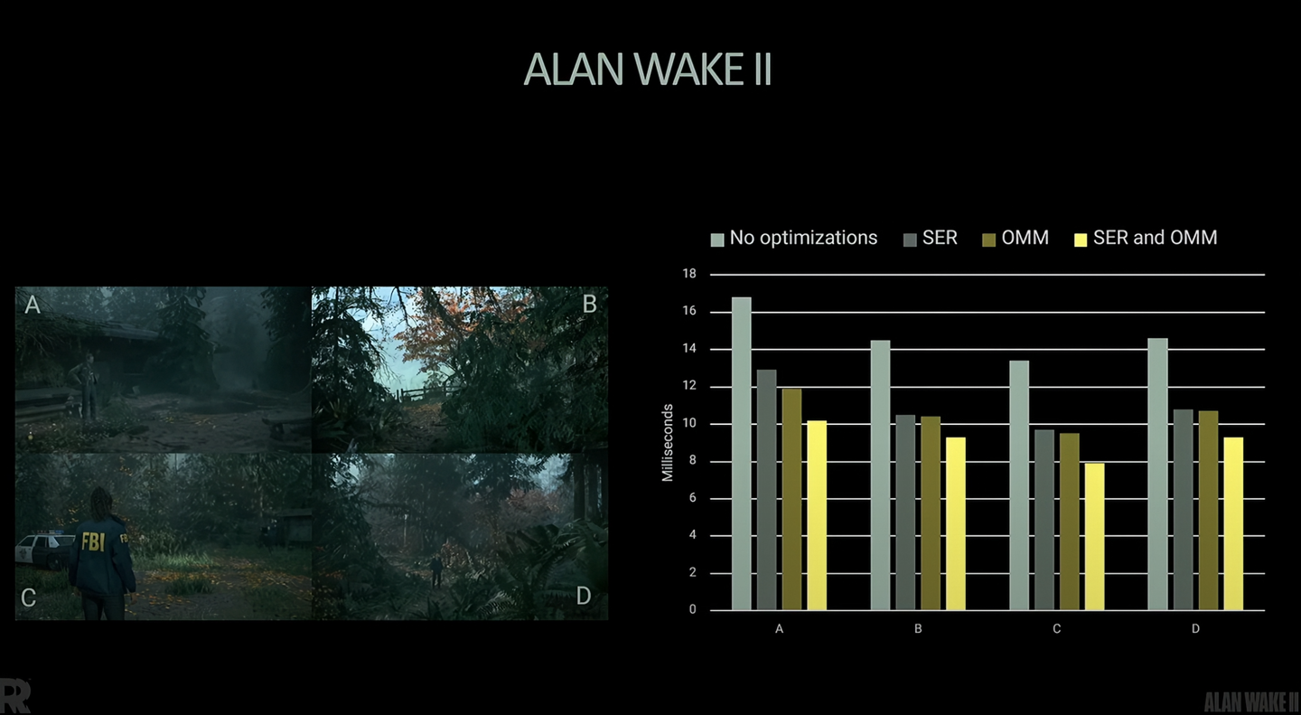 在实际应用中,该技术可为路径追踪游戏带来最高 2.3 倍的性能提升。例如在《心灵杀手》的高负载场景中,开启 OMM 和 SER 后,RTX 4090 的单帧渲染时间从 16.8 毫秒大幅缩减至 10.2 毫秒,减少 39.29%。