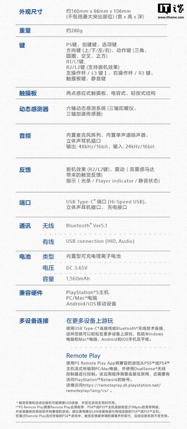 规格方面,这款限定版手柄与标准版 DualSense 手柄一致,整体重量约 280 克,尺寸约 160x66x106mm,采用蓝牙 5.1 技术,内置 1560 毫安时电池。
