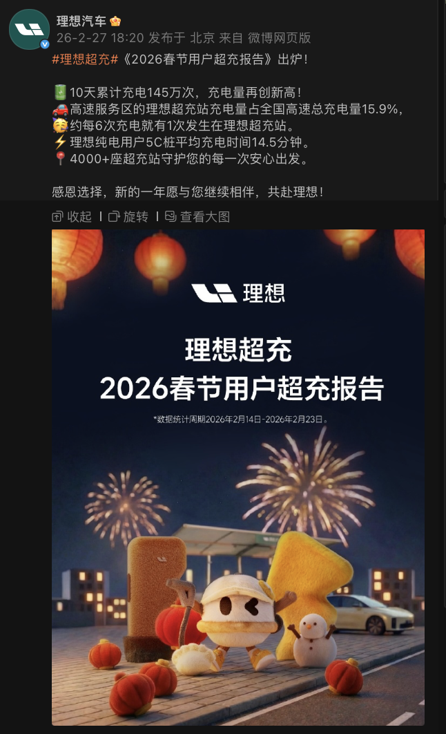 IT之家 2 月 27 日消息,理想汽车今天公布《2026 春节用户超充报告》,显示春节 10 天假期期间(2 月 14 日-2 月 23 日)累计充电次数达 145 万次,较平日增长 70%。
