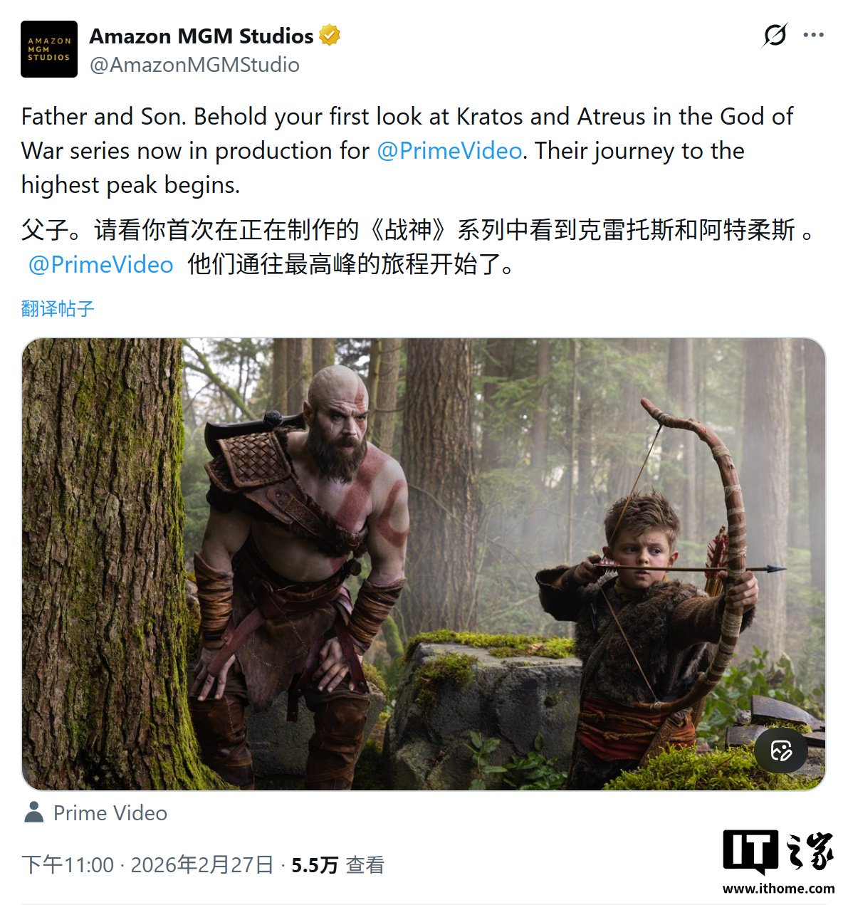 IT之家 2 月 28 日消息,亚马逊 Prime Video 昨日(2 月 27 日)在 X 平台发布推文,公开了《战神》真人剧集中奎托斯(Ryan Hurst 饰)与阿特柔斯(Callum Vinson 饰)的首张定妆照,并宣布该项目已提前启动制作。