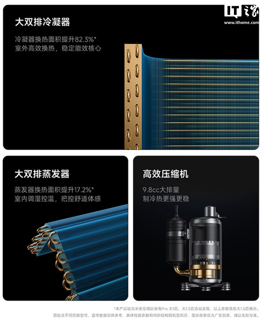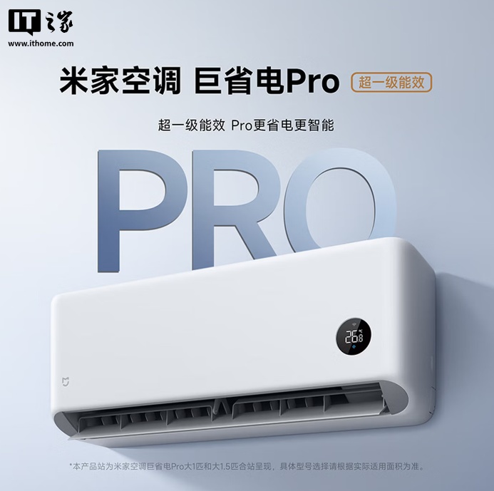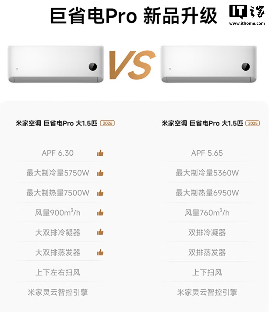 2026 款米家空调巨省电 Pro 挂机可选大 1 匹、大 1.5 匹版本,APF 提升到 6.3,最大制冷量提升到 5750W,最大制热量提升到 7500W,最大风量提升到 900m³/h,冷凝器换热面积提升 82.3%,蒸发器换热面积提升 17.2%,还增加了左右扫风。