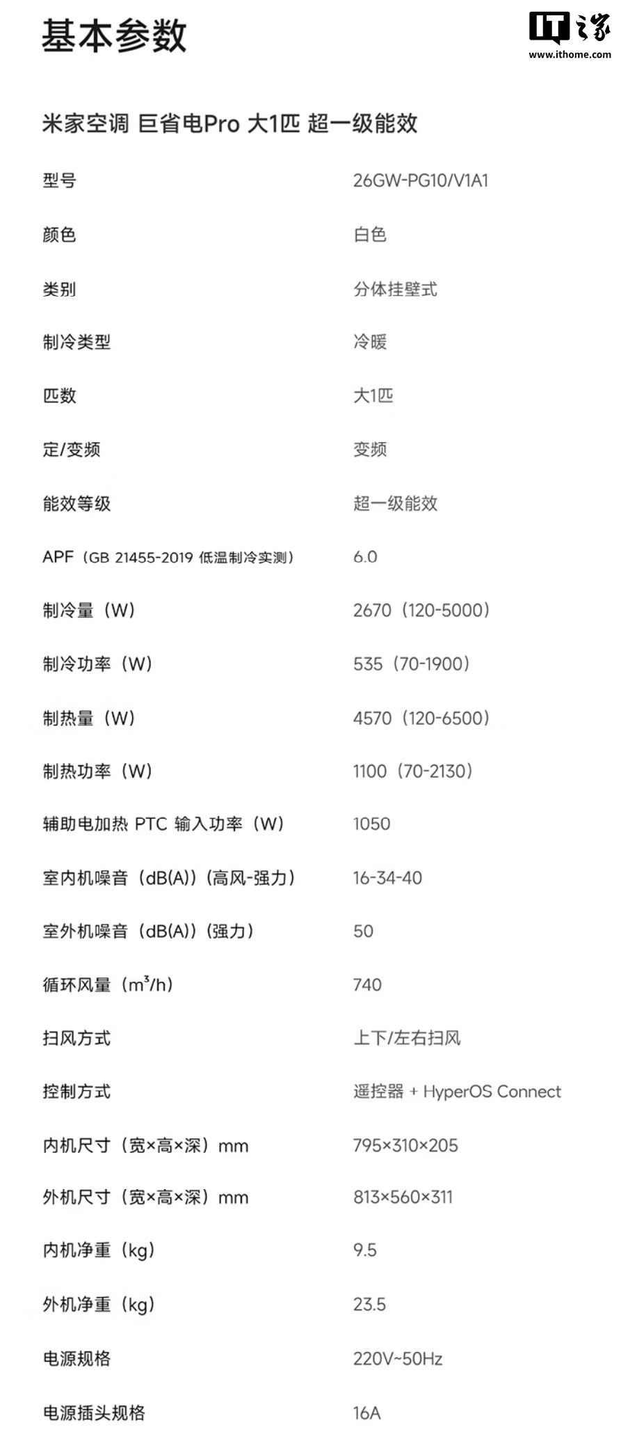 IT之家附 2026 款米家空调巨省电 Pro 挂机规格表如下: